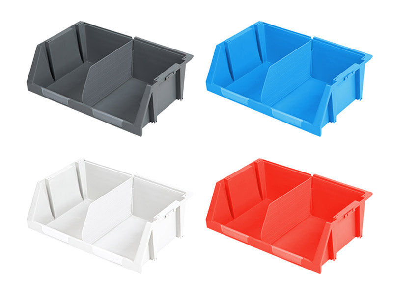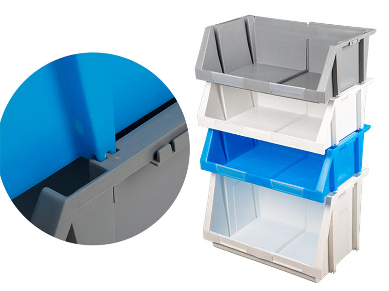 Caja plástica apilable para orden, limpieza y seguridad de materiales con soporte espacial para apilar o encajar.